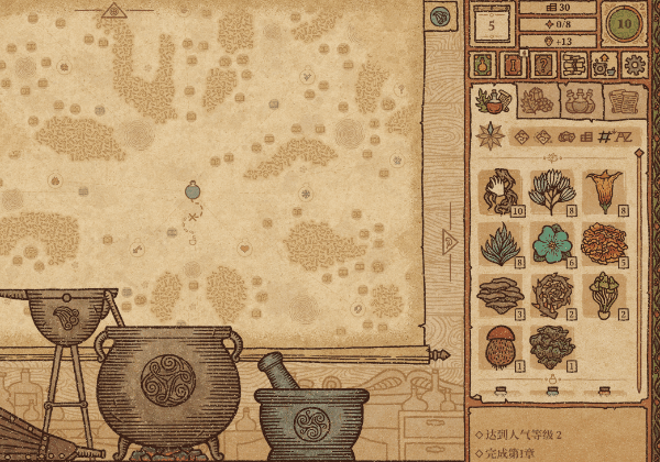 器皿的存在,则起到了移动作用,比如玩家的研磨行为,可以将药草的移动距离扩大一倍;锅中搅拌,则是决定了玩家究竟要移动到哪个点位;稀释行为则是指代了复原,让玩家的点位向原点靠近些;加热熬制则预示着此次探索的结束,当然,如果玩家所走路径没有药剂,按压手风器也不会产生什么结果。
