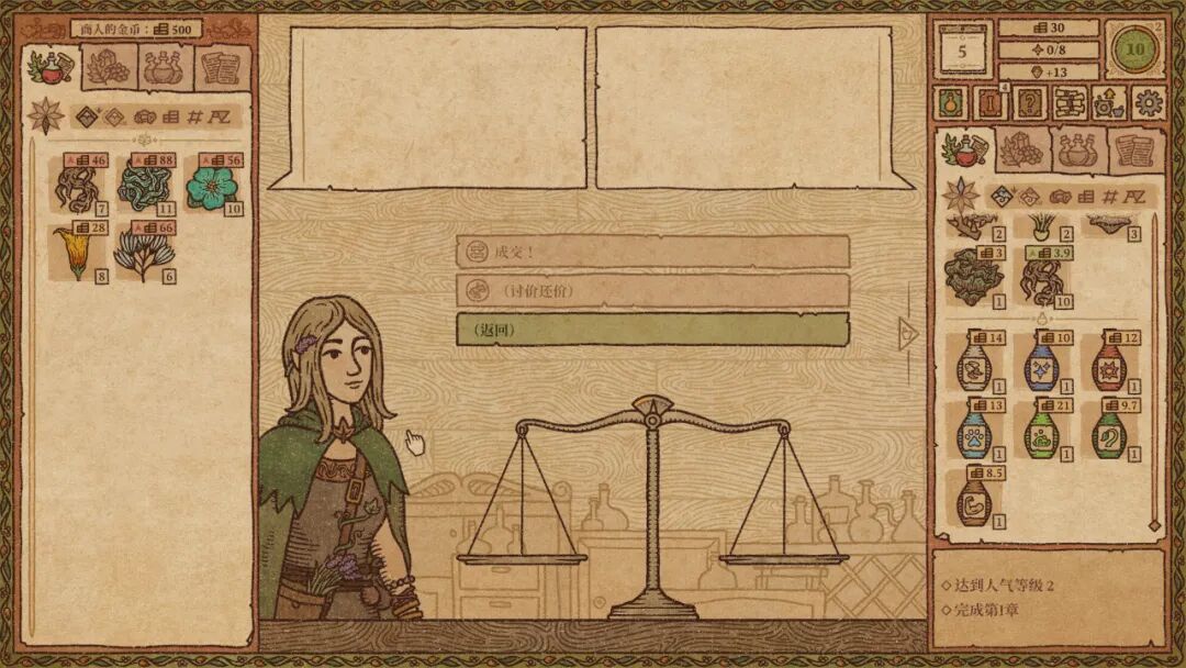有交易就有讨价还价,《药剂工艺》也有简单设计,且真的是字面意义上的简单,讨价还价时玩家需要在箭头滑动到相应区域的时候进行点击,如果反应很快,便可以得到一个满意的交易金额,在向商人售卖素材的时候也是如此。