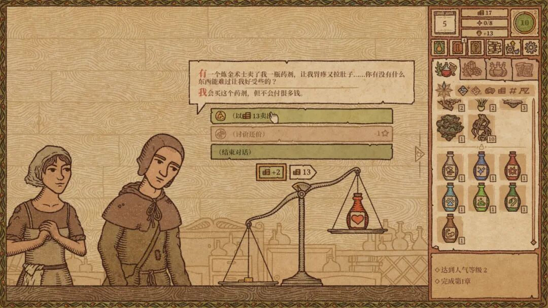 游戏还填充了一些细节让交易更加写实,倘若你卖的药会有副作用,或是药效和买家想象中不符,你就会看到村民的微笑会瞬间变成一张臭脸,他会开出更低的价格,甚至直接拒绝交易。