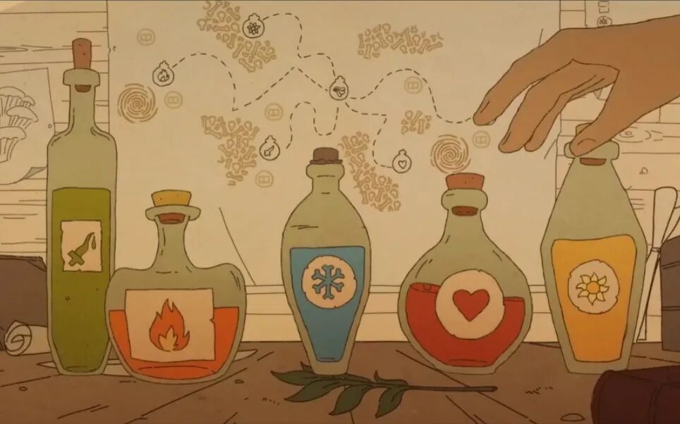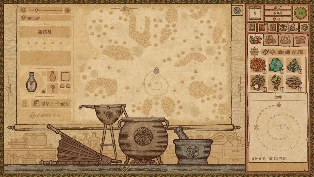 如此设计,炼金的过程自然就代表了探索行为,所以在《药剂工艺》中,每种草药都代表了一段移动方式,你选择什么药,决定了你向哪个方向展开探索。这一设计其实借鉴了西方过去关于炼金的思考,它们认为万物由水火土气构成,分别代表了东西南北,这在游戏中也有一定体现,很多药剂所处方位的设置也参考了这一理论。