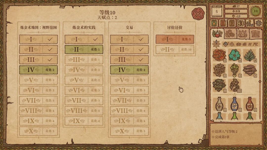地图中有很多小小的书籍图标,玩家经过后可获得相应经验,提升自身各方面能力,不只是炼金,还有讨价还价等,可见主角看得书有点“杂”。游戏也很直白的规避掉了重复劳动,探索后的地图不会再被迷雾覆盖,当玩家发现了新的药剂后,可以找到最直接的路径,而后保存配方,从配方书中进行快捷调制。