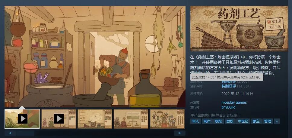 2022年12月14日,《药剂工艺》在Steam上正式上线,截至目前收获了超14000条的评价,好评率达到了92%。如此成绩与它此前的一鸣惊人也有些联系,早在一年多以前,该作就已小有名气,Steam抢先体验版更是在3天内收获了超过10万的销量。
