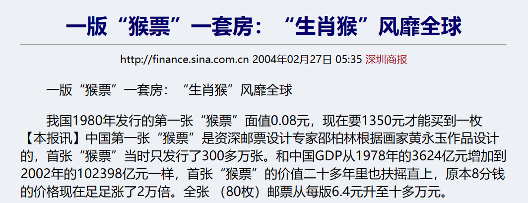 80版“猴票”之所以著名并不是因为其艺术性,而是曾经“一版猴票一套房”的暴富神话。