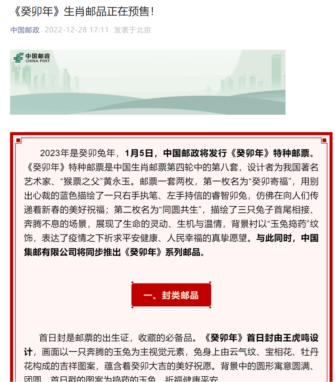 官方微博在几日前设置了“仅半年可见”和“仅粉丝可查看全部微博”,官方微信在前几日推送癸卯年邮票预售的消息时,两枚生肖邮票甚至连完整的大图展示都没挨上,介绍重点被放在了各类衍生邮品上,无论是“蓝兔子”还是“三只兔子”,都只作为配角出现。