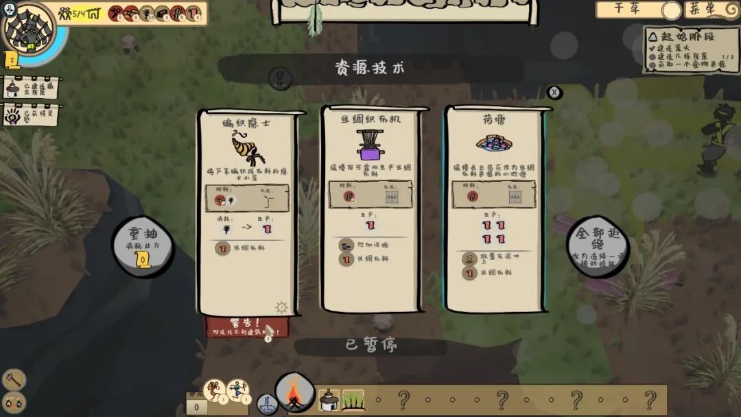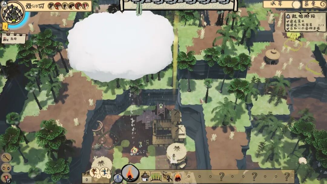 好在,尽管披着所谓“三选一”的Roguelike外皮,《海岸桃源:文明之种》的建造随机性却并不强,至少没有它的沙盒地图来得那么出彩。考虑到本作在经营系统上的极致减法,食物、材料等物资的获取渠道单一,同时获取难度也不高。更多时候,是具体的自然环境在对玩家产生更加直接的威胁。