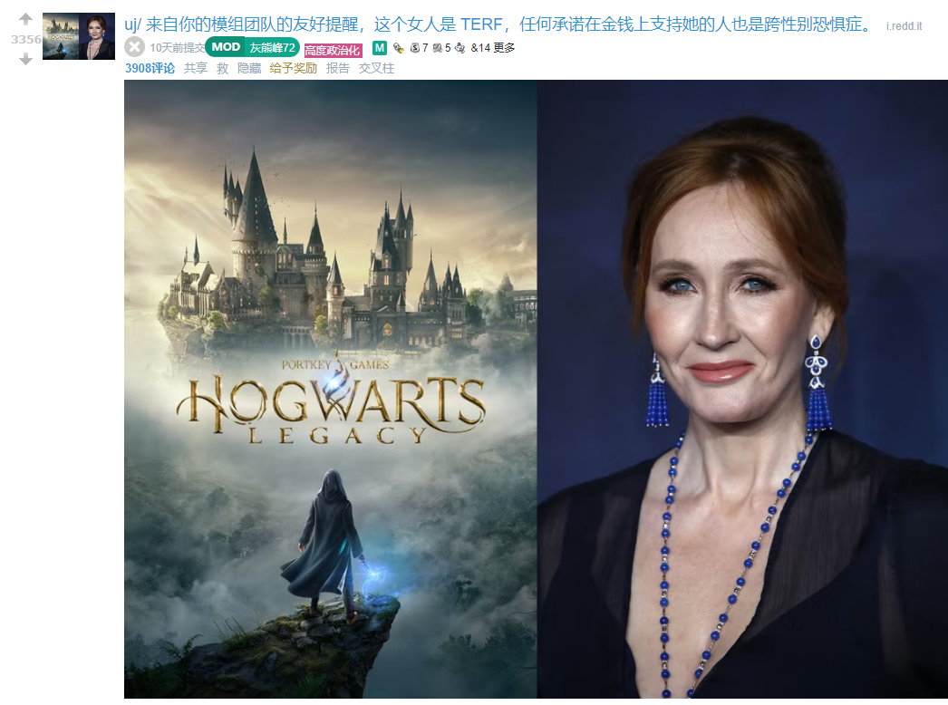 但华纳做出的这些行动收效甚微,随着《霍格沃茨:遗产》的发售日逐渐临近,依然有越来越多的人将J.K.罗琳和《霍格沃茨:遗产》联系在了一起。最近在Reddit的r/GamingCircleJerk板块上,国外网友们直接掀起了一阵反《霍格沃兹:遗产》运动,而且随着运动波及的人数越来越多,这股情绪正在席卷Reddit、4chan等国外论坛的各大板块。