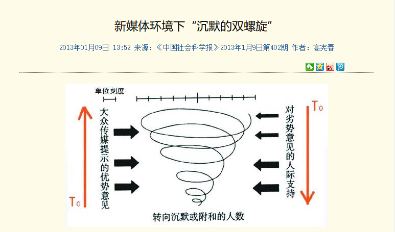 在政治学和大众传播理论中,有一个叫做“沉默的螺旋”的社会模型,这个模型大概描述了这样一个现象:“人们在表达自己想法和观点的时候,如果看到自己赞同的观点受到广泛欢迎,就会积极参与进来,这类观点就会越发大胆地发表和扩散;而发觉某一观点无人或很少有人理会(有时会有群起而攻之的遭遇),即使自己赞同它,也会保持沉默。”