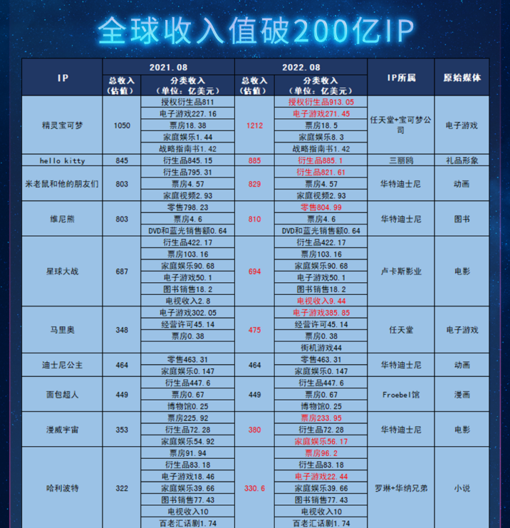 凭借着老少皆宜的内容,“哈利·波特”以对现实和魔法世界亦真亦幻的细致描写,充满了读者的想象空间,为自己打下了广泛且强大的粉丝基础。而且,J.K.罗琳和华纳多年对其内容不留余力的挖掘与运营,也让“哈利·波特”的身价,变得和它的世界观一样庞大。截至2022年8月,“哈利·波特”依靠着330.6亿美元的身价,成为全世界价值前十的超级IP。